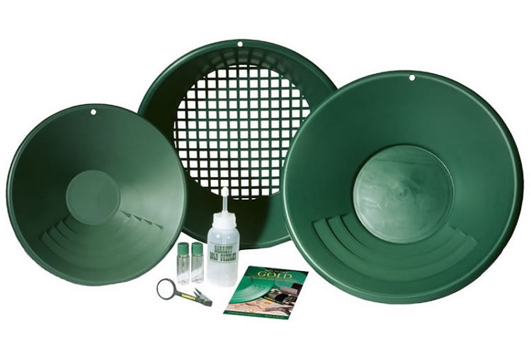Garrett Goudpannenset bestaande uit: 14" Prospector goudpan, 10" Backpacker goudpan, zeef, Gold Guzzler flesje, 2 flacons voor goud, pincet, boekje:...