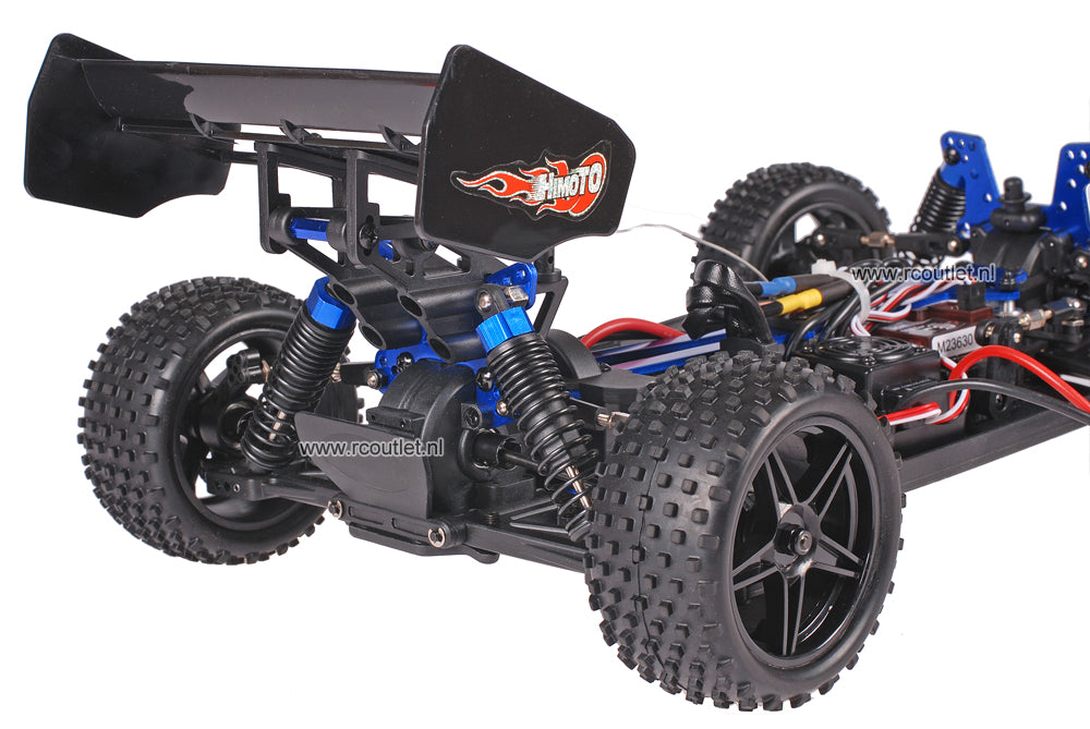 De Himoto 1:10 Brushless Buggy is voor iedereen die van snelheid houdt. De buggy kan worden uitgerust met drie verschillende brushless motor en snelheidsregelaar setjes: 50A regelaar met 3500kV motor, 80A regelaar met 4000kV motor en 120A regelaar met 3150kV motor. U kunt over deze verschillende setjes meer lezen hieronder en uw keuze in de opties aangeven. Met deze snelle setjes van het bekende merk Hobby Wing kun je maar liefst een maximale snelheid van wel 90 km/uur behalen! (Let op, voor deze snelheden heb je een 11.1V LiPo accu + LiPo lader nodig). Tevens is het grote voordeel van brushless motoren dat deze veel langer mee gaan dan de goedkopere brushed motoren(met koolstofborstels) door minder slijtagegevoelige onderdelen. De Himoto Brushless Buggy is 4 Wiel aangedreven voor maximale grip op ruw terrein en is uitgerust met 4 olie gevulde schokbrekers om de zwaarste klappen op te kunnen vangen. Ook de noppenbanden zorgen voor maximale controle op ieder terrein en met de krachtige 2.4GHz zender heb je een bereik van ruim 100 meter zonder storingen van omgevingssignalen en kun je zonder problemen met meerdere auto's tegelijk rijden (NIEUW! De Himoto 2,4GHz PRO zenders (optioneel) zijn traploos te begrenzen in snelheid om op lage snelheid te kunnen leren rijden. Het is zelfs mogelijk om de snelheid terug te voeren naar stapvoets rijden, een uniek voordeel dat de Traxxas zenders bijvoorbeeld niet hebben en ideaal voor beginners en jonge coureurs!). De Buggy accelereert zeer snel door zijn lage gewicht en relatief kleine banden maar heeft ook een enorme topsnelheid door de 8,038:1 tandwiel verhouding. Doordat de Buggy relatief laag bij de grond ligt kun je met extreem hoge snelheden scherpe bochten maken zonder de controle over de wagen te verliezen of over de kop te slaan. Deze wagens zijn ideaal voor het rijden in bijvoorbeeld gras zand, grind, maar ook op de weg hebben ze maximaal vermogen. De auto heeft een duurzame body, dat gedeeltelijk opgebouwd is uit aluminium en hierdoor beter bestand is tegen crashes dan standaard PVC bodies. De hoge ontlaadstroom tot wel 150 Ampere van hoge capaciteit LiPo accu's maakt het mogelijk het maximale uit de motor te halen en de auto sneller te laten accelereren dan welke nitro auto ook, met snelheden tot wel 90 km/uur! Kortom een aanrader voor iedereen die houdt van extreme krachten en snelheden. Tevens zijn er zeer veel upgrades te krijgen voor dit model, zoals zwaardere accu's, snelladers, aluminium upgrade onderdelen en losse kappen. Dit model wordt volledig rijklaar geleverd inclusief 2.4GHz zender, 7,2V 2000mAh NiMH Accu, Acculader, Nederlandse handleiding en 1 jaar garantie.